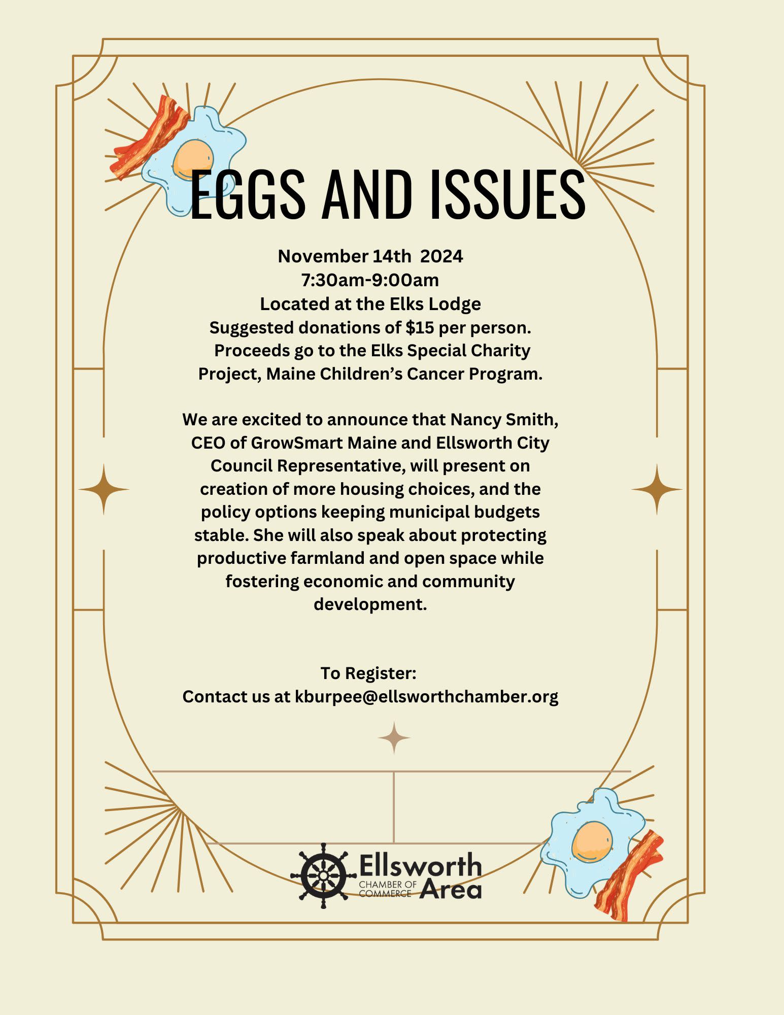 November 14th 2024 7:30am-9:00am Located at the Elks Lodge Suggested donations of $15 per person. Proceeds go to the Elks Special Charity Project, Maine Children’s Cancer Program. We are excited to announce that Nancy Smith, CEO of GrowSmart Maine and Ellsworth City Council Representative, will present on creation of more housing choices, and the policy options keeping municipal budgets stable. She will also speak about protecting productive farmland and open space while fostering economic and community development. To Register: Contact us at kburpee@ellsworthchamber.orgImages